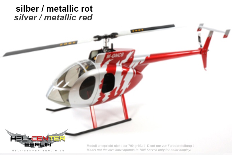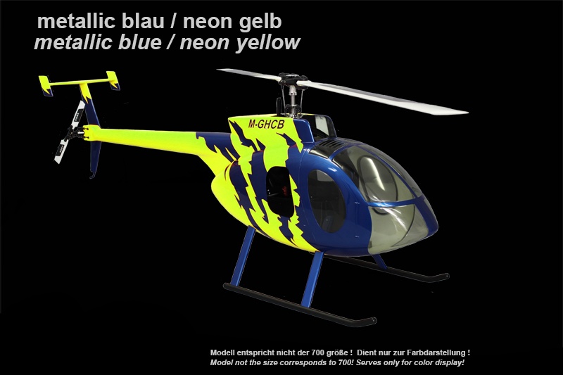 To give also Pilots with a 700 Mechanic the possibility to fly a fusalege, we developed a "bigger" Hughes 500. The Hughes 500 fuselage is going to delivered with a high end paint job and nearly ready to build. Setup of fuselage and integration of the Mechanic can be achived in short time. The mechanic will be mounted on a lightweight and strong Carbon box, which is integral part of the fuselage. Frontpart is hold in position with 6 bolts and 4 strong magnets. This eases the access without tools. The fuselage is made with Fiberglas and carbonfiber (80%) . The complete fuselage is handmade and Made in Germany !